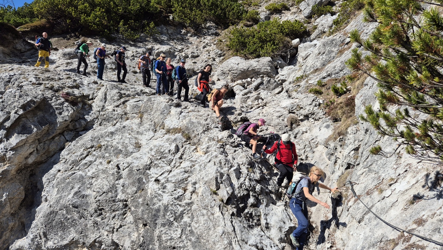 Bei so herrlichem Wetter und der sensationellen Aussicht, auch hinüber zur Passauer Hütte und dem Birnhorn, hat der Wanderleiter ein Herz für die Teilnehmer und schlug vor, auf der Hütte eine einstündige Pause einzulegen. – Schon war die Stunde vorbei und Josef S. rief zum Aufbruch. Im Vorfeld hatte er mit Hüttenwirt und Hüttenwart die Weg- bzw Schneeverhältnisse abgeklärt, jedoch keine sichere Auskunft bekommen, deshalb gab es hier auf der Hütte eine kurze Information für die Teilnehmer – „bei unsicheren Verhältnissen mach wir kehrt“. Nach einigen Schneefeldern zwischen den Latschen war aber dann der felsige Steig unterhalb des Persailhorns problemlos begehbar – alle hatten ihre Freude am Steig mit der tollen Aussicht ins Tal. In stetigem Auf und Ab, immer mit teils hohen Stufen, war es für alle einfach ein Erlebnis.
