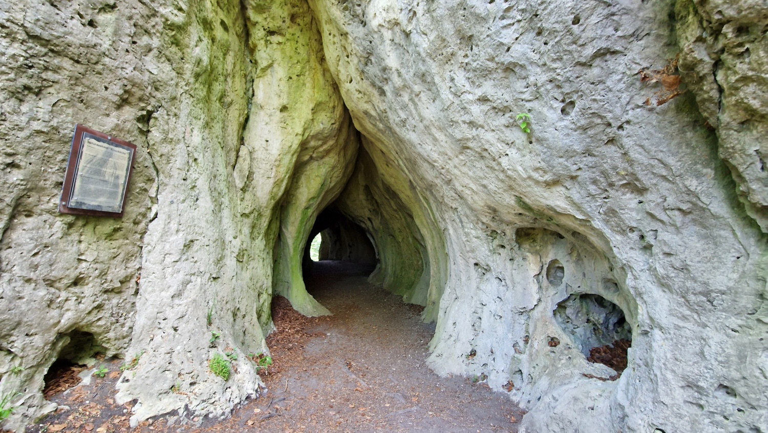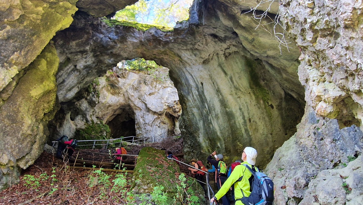Start war am Sonntag um 06.00 Uhr in Waldkirchen mit einem Kleinbus und einem PKW nach Doos im Wiesental. Dort angekommen führte der Weg zuerst auf einer Brücke über die Wiesent und ein Stück flussabwärts bis abermals ein Steg über die Wiesent führte. Kurz danach erreichte man die Höhlenruine Riesenburg, deren Naturbrücken und Felsen Überreste eines eingestürzten Höhlendaches sind. Durch das Gelände dieser eindrucksvollen Versturzhöhle ging es auf steilem Weg hinauf nach Engelhardsberg. Auf Feldwegen und einem romantischen Waldwurzelpfädchen führte der Weg zum Adlerstein, wo eine Eisenleiter den Aufstieg auf den aussichtsreichen Felsturm erleichterte. Das nächste Ziel, das Quackenschloss, die Ruine eines ehemaligen Höhensystems war bald erreicht und durch den Zwecklesgraben wanderte die Gruppe zur Oswaldhöhle, eine 62 m lange Durchgangshöhle im Hohlen Berg bei Muggendorf.