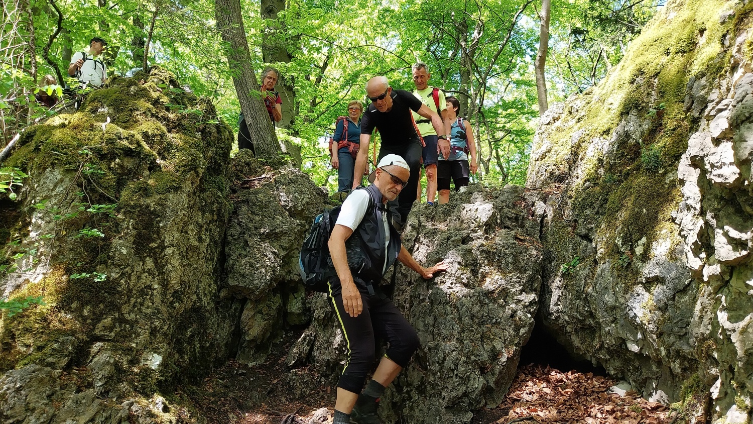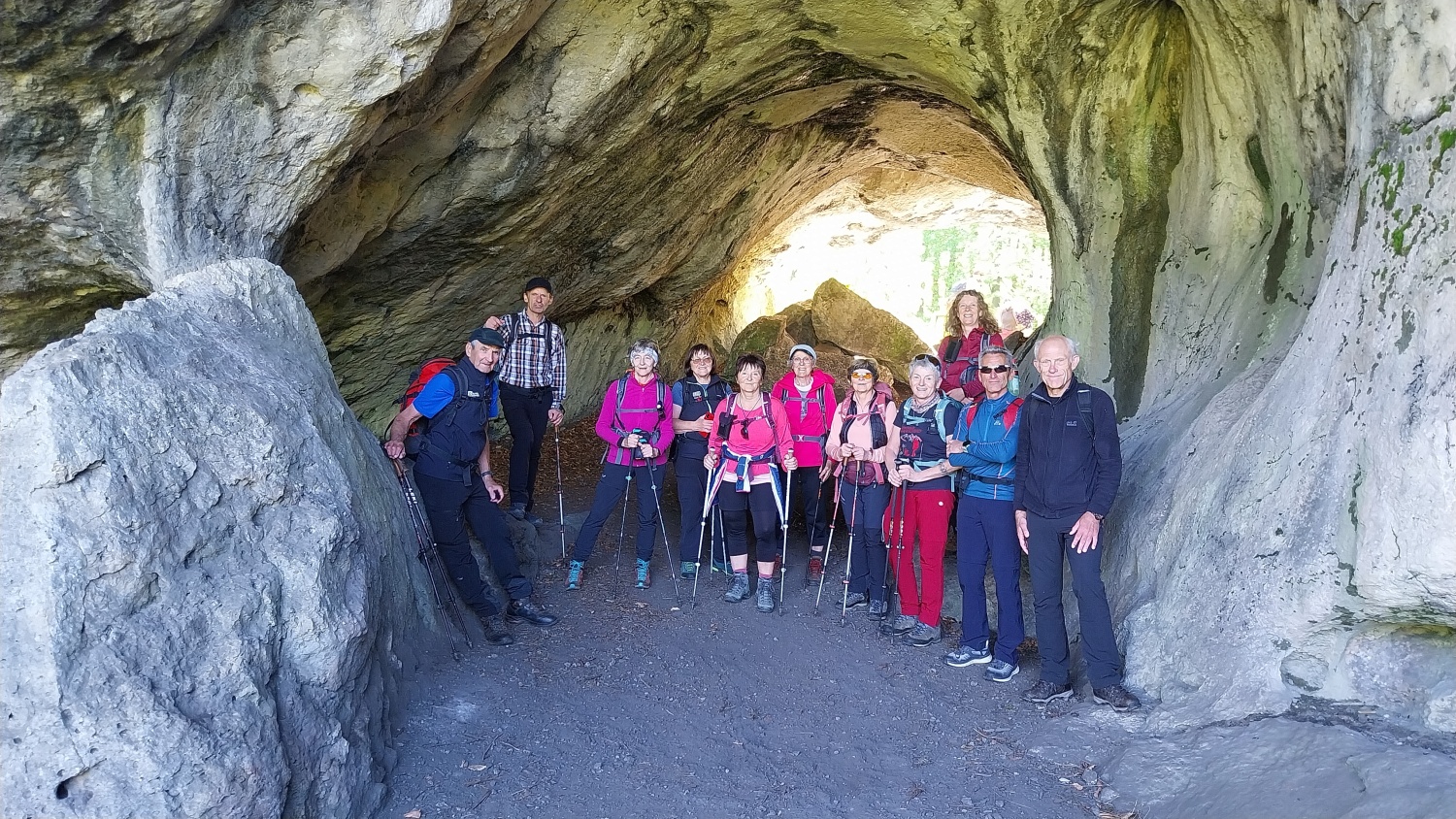 Nach dem Frühstück am zweiten Tag fuhr die Gruppe bei wiederum herrlichem Wetter nach Betzenstein, von wo die erste Wanderung dieses Tages „Rund um Betzenstein“ gestartet wurde. Ca. 500 m nach dem Parkplatz war schon das erste Ziel die Klauskirche, eine 32 m lange Durchgangshöhle erreicht. Durch diese führte der Wanderweg vorbei am Freibad und am Klettergarten zu einem Aussichtspunkt auf die Ortschaft. Das nächste Ziel, das Naturdenkmal Hexentor, ein fast kreisrundesFelsentor, das als keltischer Kraftort gilt, war bald darauf erreicht. Der Weiterweg führte entlang des Badersberges zum Berghäusl, einer Schutzhütte inmitten der Felsenwelt. Auf einem Treppenabstieg vorbei am Friedhof erreichte man durch den Torturm das denkmalgeschützte Ensemble der Altstadt von Betzenstein. Vorbei an der historischen Stadtmauer zweigte der Weg hinauf zum Schmidberg mit dem Aussichtsturm ab, wo man einen herrlichen Blick hinunter in die Ortschaft und zu den beiden Burgen gegenüber hatte. Der Markierung folgend kam die Gruppe vorbei an der Laufer Hütte zur Straße. Nach dem überqueren führte der Weg teils durch Buchenwald, teils am Waldrand auf dem „Pfad der Liebe“ vorbei an beeindruckenden Felslandschaften und entlang einer Siedlung zu einer Dorfstraße. Von hier ging es wieder bergauf zum Aussichtspunkt auf dem „Gerhardfelsen“. Von hier ging es wieder bergab durch einen schönen Laubwald bis zur Straße nach Stierberg, auf der die Gruppe rechts haltend wieder den Parkplatz in Betzenstein erreichte.