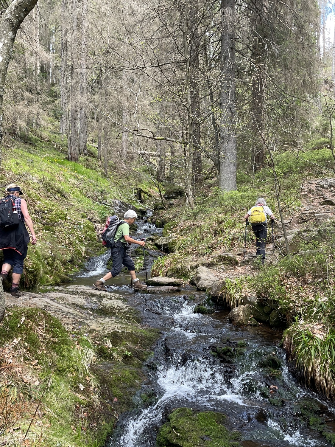 Diese Tour ist eine feste Größe im jährlichen Tourenprogramm der Ortsgruppe. Die Anfahrt ging dieses Mal über Grafenau bis Rinchnach, dann weiter bis Zwiesel und schließlich auf gewohntem Weg nach Scheuereck. Die Ursache dafür war eine Umleitung wegen einer Baustelle in Frauenau. Die Wanderung begann durch einen sehr schönen Frühlingswald am Höllbach entlang zur Höllbachschwelle. An diesem idyllisch gelegenen Platz wurde eine kurze Trinkpause eingelegt, bevor es in stetigem bergauf weiter zum Wasserfall ging. Ab hier ist der Weg durch das Höllbachgspreng wegen der Wanderfalkenbrut momentan gesperrt.