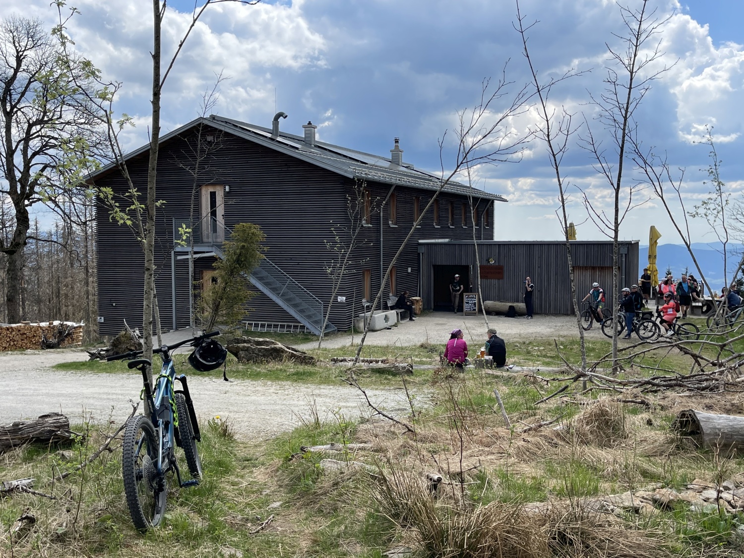 Die Umleitung führte immer entlang des Höllbachs zur Schachtenstraße und weiter zum Sulzschachten. Nun wurde der Weg etwas flacher und es war nicht zu übersehen, dass der Schnee noch nicht lange weggetaut ist. Am Falkenstein angekommen, wartete eine schöne Rundumsicht z.B. zum Mittagsberg und in Richtung Böhmisch Eisenstein auf die Gruppe. Am Gipfel gab es wie üblich das Gruppenfoto mit dem Gipfelkreuz, anschließend freuten sich die Wanderer auf die Einkehr in das Schutzhaus des Waldvereins, zur verdienten Pause mit vorzüglichem Essen.