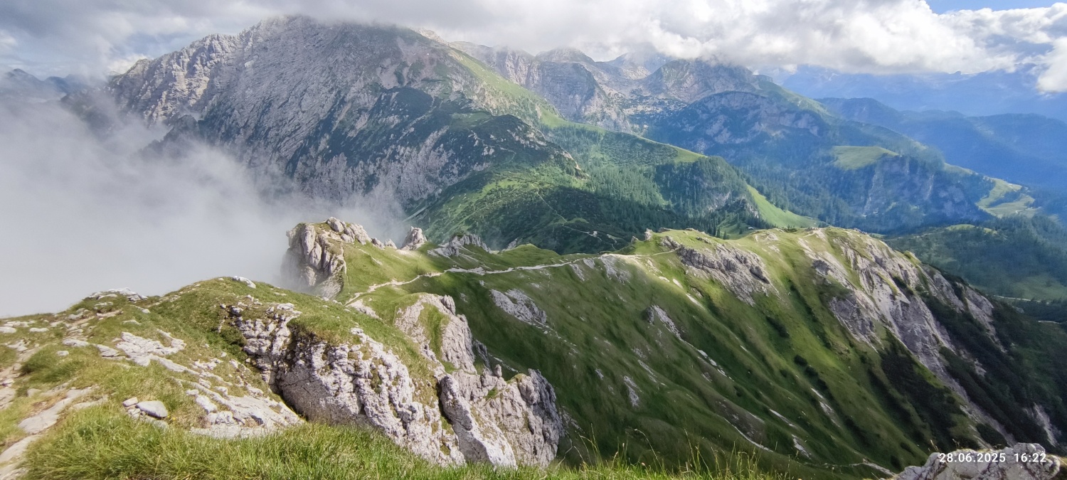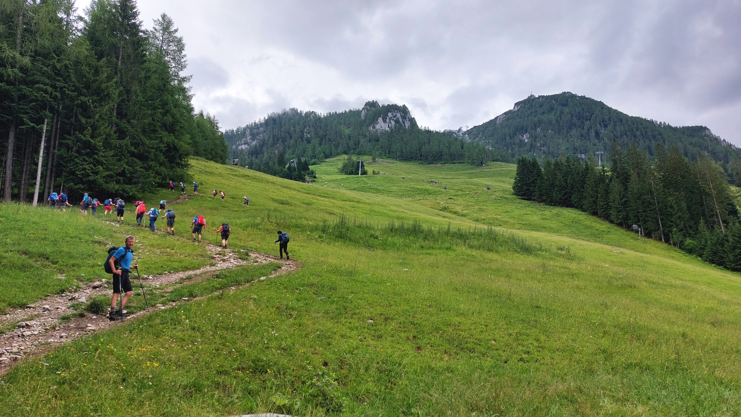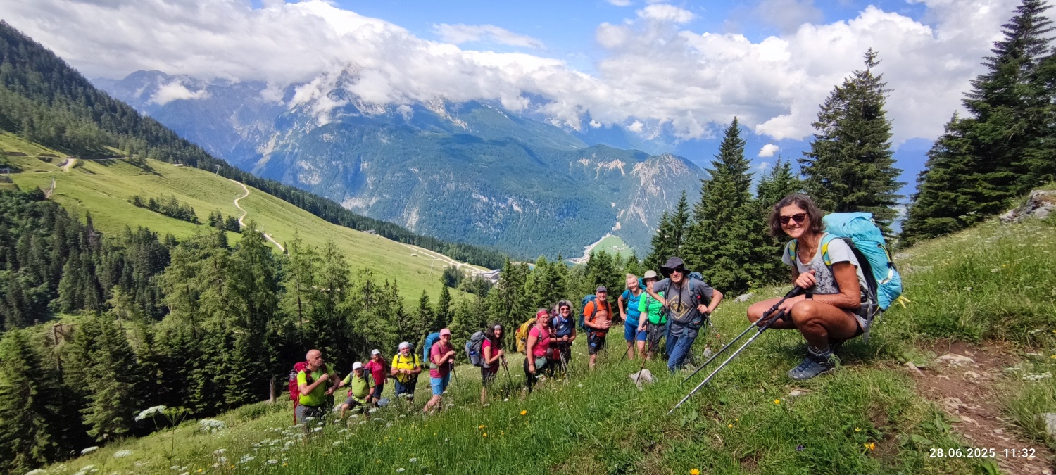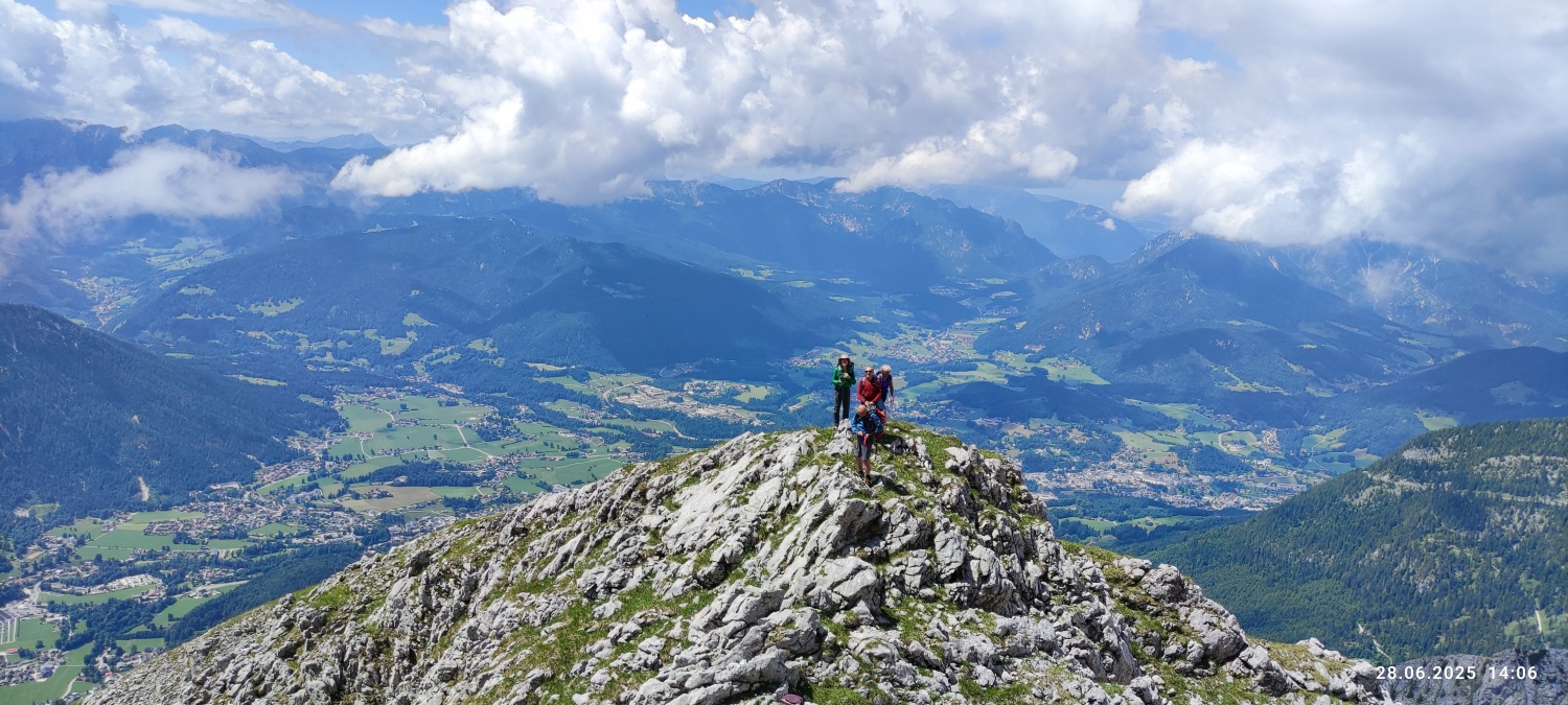 Bereits im Sommer 2024 begannen die Planungen für die zweitägige Jubiläumstour aus Anlass des 55-jährigen Bestehens der DAV- Ortsgruppe Freyung, welche am 10. Juni 1970 im Hotel zur Post in Freyung gegründet wurde. 55 Mitglieder bekamen die Möglichkeit, auf verschiedenen Routen ein gemeinsames Ziel zu erwandern: das Schneibsteinhaus in den Berchtesgadener Bergen. Diese Teilnehmerzahl war rasch erreicht und die detaillierten Planungen für diesen besonderen Ausflug konnten beginnen. Am letzten Juniwochenende war es dann so weit! Mit einem komfortablen Reisebus der Fa. Prager, Freyung, ging die Fahrt über Salzburg nach Hinterbrand bei Berchtesgaden. Auf etwa 1100 m Seehöhe begann dann nach Komplettierung der Ausrüstung der Aufstieg in Richtung „Schneibsteinhaus“. Die teilnehmenden Tourenleiter der Ortsgruppe haben sich im Vorfeld verständigt, dass jeder eine andere, mehr oder weniger anspruchsvolle Route für den Aufstieg plant und anbietet, damit dann der Start am Samstag reibungslos von statten geht. So ging Hans Donaubauer mit seiner Gruppe über die Brettgabel des Göllstockes und zurück über das Hohe Brett (2340m), Lothar Schäfer über die Königsbergalm und Rita Gell über die Mitterkaseralm den direkten Weg zur Hütte.