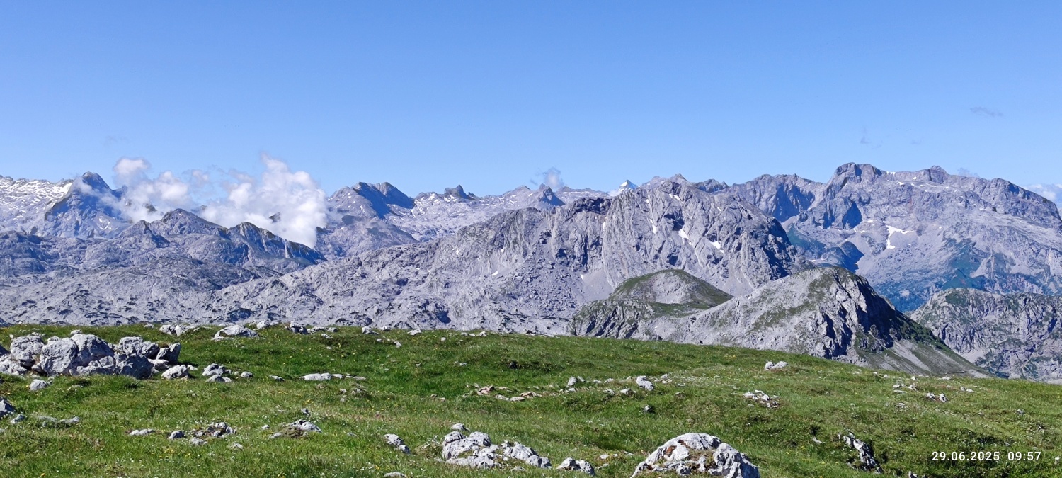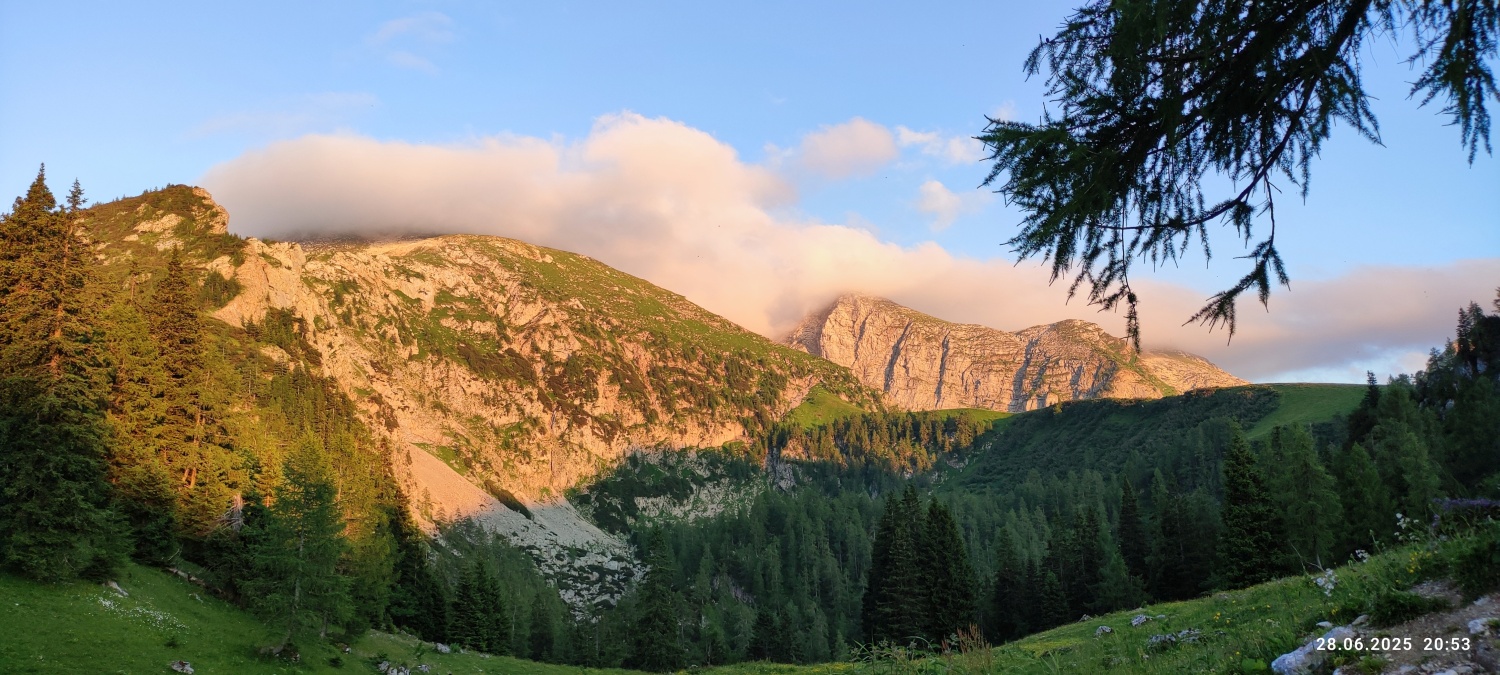 Nach Anmeldung bzw. kurzem Aufenthalt auf der Hütte, teilten sich die Teilnehmer erneut auf. Manche gingen auf den Gipfel des Jenner (1874 m) und andere auf den Pfaffenkegel (1850 m) und wieder andere folgten dem Weg zum Schneibsteingipfel. Als dann die Zeit schon fortgeschritten war, kamen alle wieder zurück, um das herrliche Wetter mit Sonnenschein und angenehmen Temperaturen auf der Terrasse noch kurz zu genießen, bevor dann gegen 18.00 Uhr der Hüttenwirt Stefan seine Gäste zum Abendessen rief. Bei Vorspeise und wunderschön angerichtetem Buffet konnten sich die Mitglieder der Ortsgruppe hervorragend und ausgiebig bedienen, bevor dann die Nachspeise noch serviert wurde. Am Abend des ersten Tages konnten alle auf der Terrasse die umliegenden Gipfel bis hin zum Watzmann und die Täler mit ihren Almen um die Hütten bestaunen und einen wunderbaren und kurzweiligen Abend genießen, bevor dann Zeit war für die Hüttenruhe.