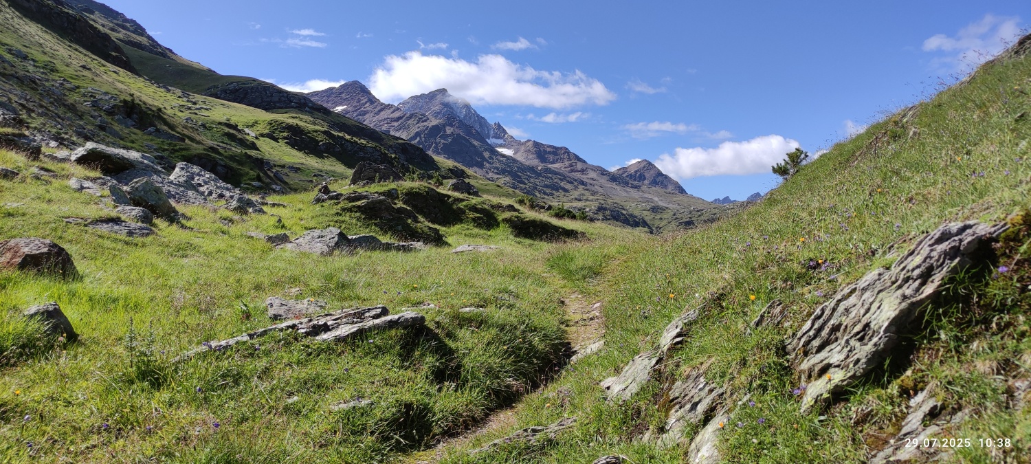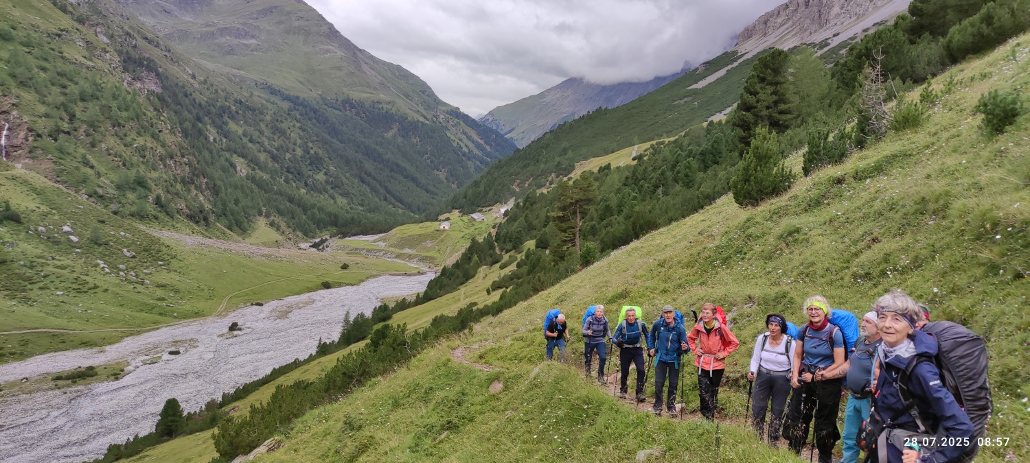 Im Rahmen dieses Projektes hat Hans Donaubauer Wanderleiter der DAV Sektion Passau, Ortsgruppe Freyung, eine 4-tägige Bergtour von Bormio bis zum Gaviapass organisiert. Im 9-Sitzer Bus war schon die Anreise über den Umbrail Pass ein kleines Abenteuer. Gegen Mittag war der Startpunkt oberhalb von Bormio erreicht. Durch märchenhaften Lärchenwald ging es auf dem Pedemontana della Reit hinein in das Valle dello Zebru, am rauschenden Gletscherfluss entlang, bis zur ersten Übernachtungsstation, dem Rifugio Campo auf 2000 m. Eine kleine Almhütte, die von jungen Leuten sehr gut geführt wird.