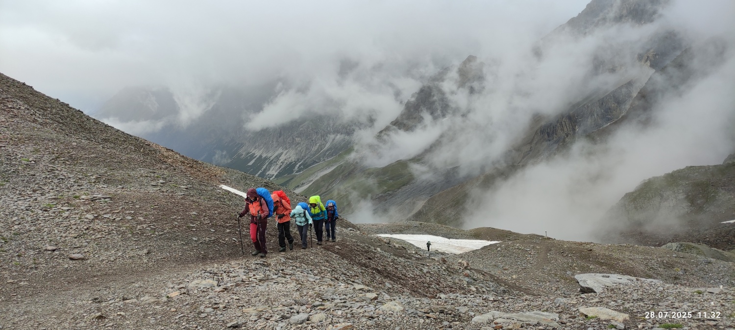 Am zweiten Tag stand eine wahre Königsetappe auf dem Programm. Am Fuß von Königsspitze und Monte Cevedale, ging es aus dem satten Grün der Almwiesen hinauf ins karge Bergland, bis zur magischen Dreitausender-Grenze am Zebrupass. Tiefhängende Wolken gaben immer wieder den Blick frei auf die Bergriesen, allesamt über 3500 m, mit ihren Gletscherzungen – zum Greifen nahe. Erfüllt von diesen Eindrücken stieg die Gruppe ins grüne Valle die Forni ab, zur zweiten Unterkunft, dem Stella Alpina auf 2061 m, schon mehr Pension als Berghütte, aber urgemütlich.