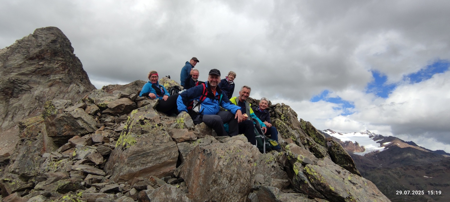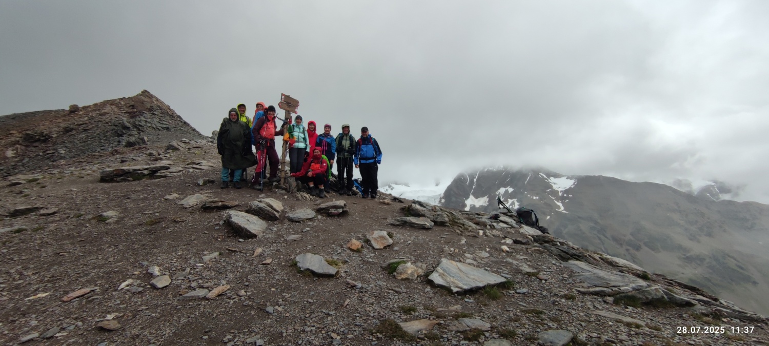 Der dritte Tag brachte den ersehnten strahlend blauen Himmel. Perfekt für die atemberaubende Wanderung auf den Dosso Tresero 2356 m, mit herrlichem Ausblick hinab auf Santa Caterina und zurück auf die gesamte Route der vergangenen Tage. Weiter ging es entlang von Wasserfällen und über zahlreiche Gletscherbäche, die allesamt den Torrente Gavia speisen. Langsam kam das Ziel, der Gaviapass 2652 m in Sicht, eingerahmt vom Corno dei Tre Signori 3360 m und dem Monte Gavia 3220 m. Direkt auf der Passhöhe lag die letzte Übernachtungsstation, das Rifugio Bonetta. Hoch frequentiert von unzähligen Motorrad-Bikern und Radfahrern, welche die berühmte Bergetappe der „giro d´italia“ fahren wollen. Nach kurzer Rast war noch genügend Zeit, den Monte Gavia 3220 m zu besteigen, um nochmal den herrlichen Rundumblick auf die Ortler Alpen zu genießen.