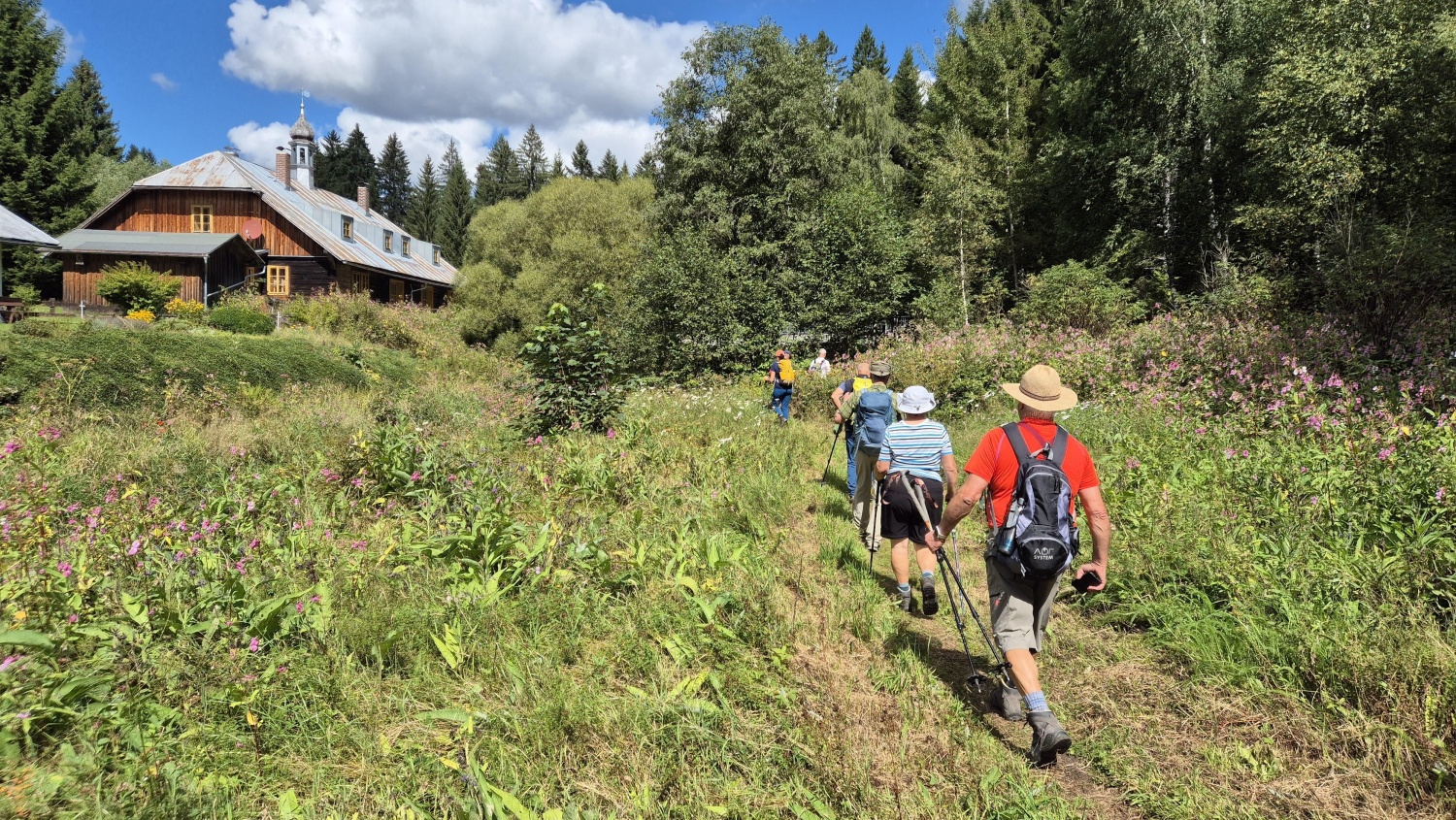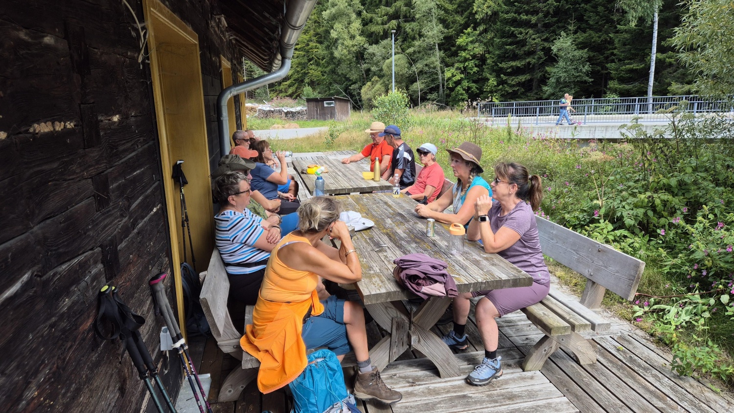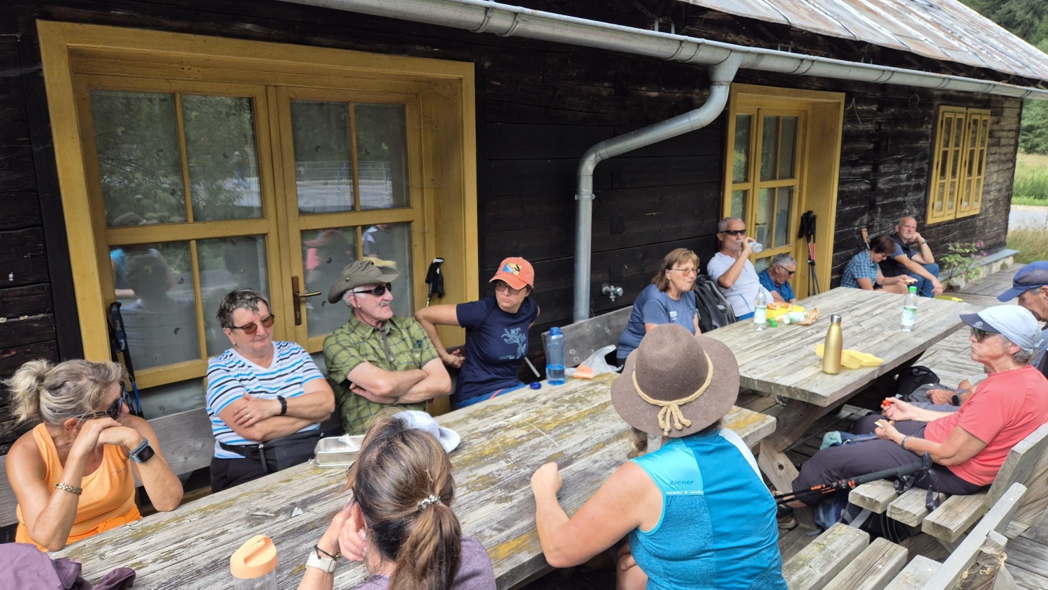Unter dem Vordach eines der verlassenen großen Holzhäuser an der Seebachschleife fanden die Wanderer ein schattiges Plätzchen für eine zünftige Brotzeit. Hier befand sich vor über 150 Jahren die bedeutendste Spiegelschleife Bayerns. Von 1919 bis 1928 diente die Seebachschleife als Brillengläser-Schleiferei für das Regener Werk der Firma Rodenstock.