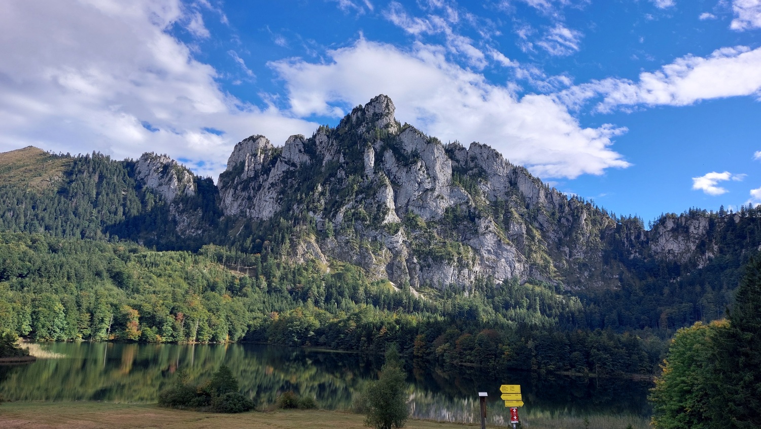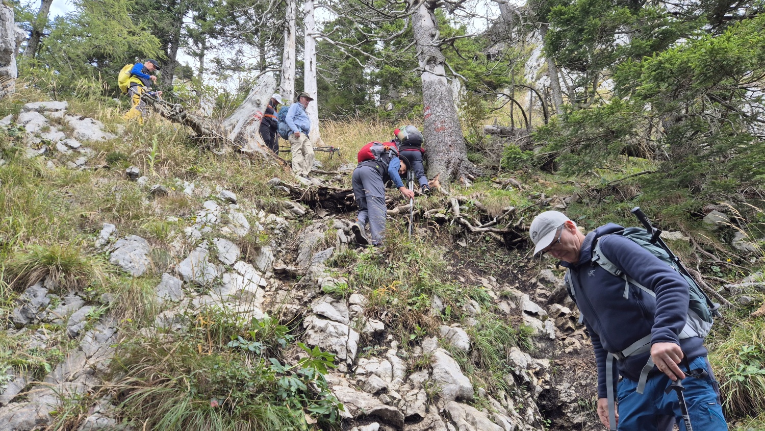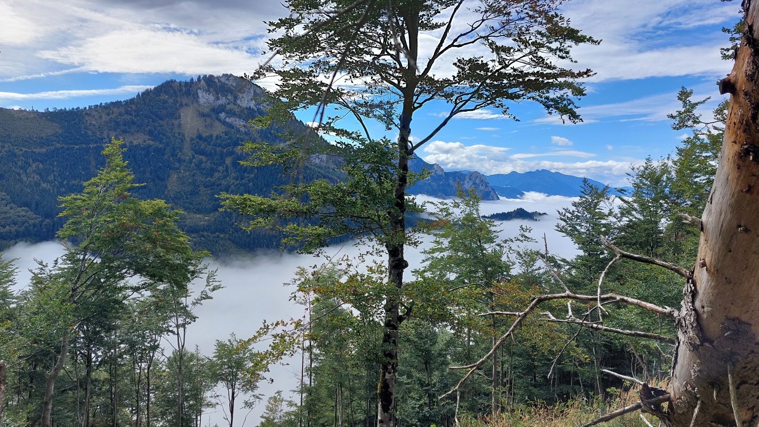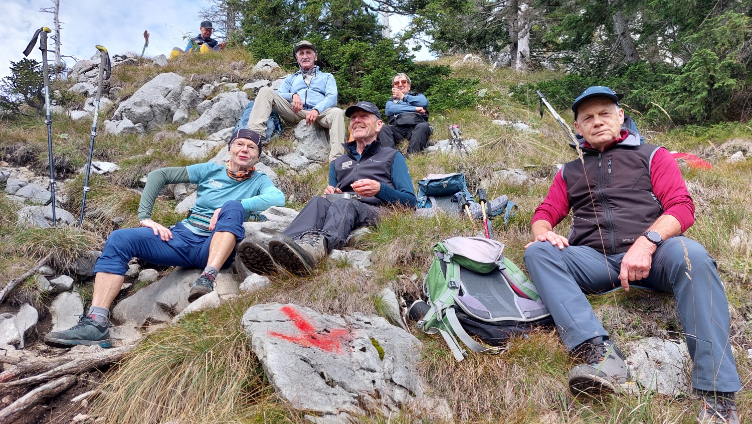 Die Touren gingen auf weniger bekannte Gipfel des Toten Gebirges. Am ersten Tag führte der Tourenleiter seine Begleiter per Seilbahn auf den 986 m hohen Grünberg und dann per pedes vorbei am Baumwipfelpfad mit seinem Aussichtsturm zu dem fast 100 m tiefer liegenden Laudachsee. Von dort führte der Weg hinein in einen teils versicherten Felsensteig, steil bergauf bis zur Hohen Scharte auf 1105 m. Ab hier ging es nun weiter aufwärts, immer entlang der Felsen- Abbruchkante, bis das Katzensteinfenster erreicht war. Nun führte der Felsensteig kurz abwärts, vorbei an der Gamsluckn und dann hinauf auf den Katzenstein mit 1349 m Höhe. Dort bot sich in herrlicher Ausblick zurück zum Laudachsee, auf den Traunsee und auf den benachbarten Traunstein, aber auch auf das Tagesziel des nächsten Tages. Der Rückweg entsprach dem Aufstiegsweg und wurde nur unterbrochen von einer Einkehr in der Ramsaualm knapp über dem Laudachsee. Nach der Rückkehr an der Talstation ging die Fahrt etwa 10 Km zum gebuchten Quartier „URZN“ in Altmünster, hoch über dem Traunsee. Mit schmackhaftem Essen und netten Gesprächen war der Abend schnell vorbei und alle freuten sich schon auf Tag zwei.