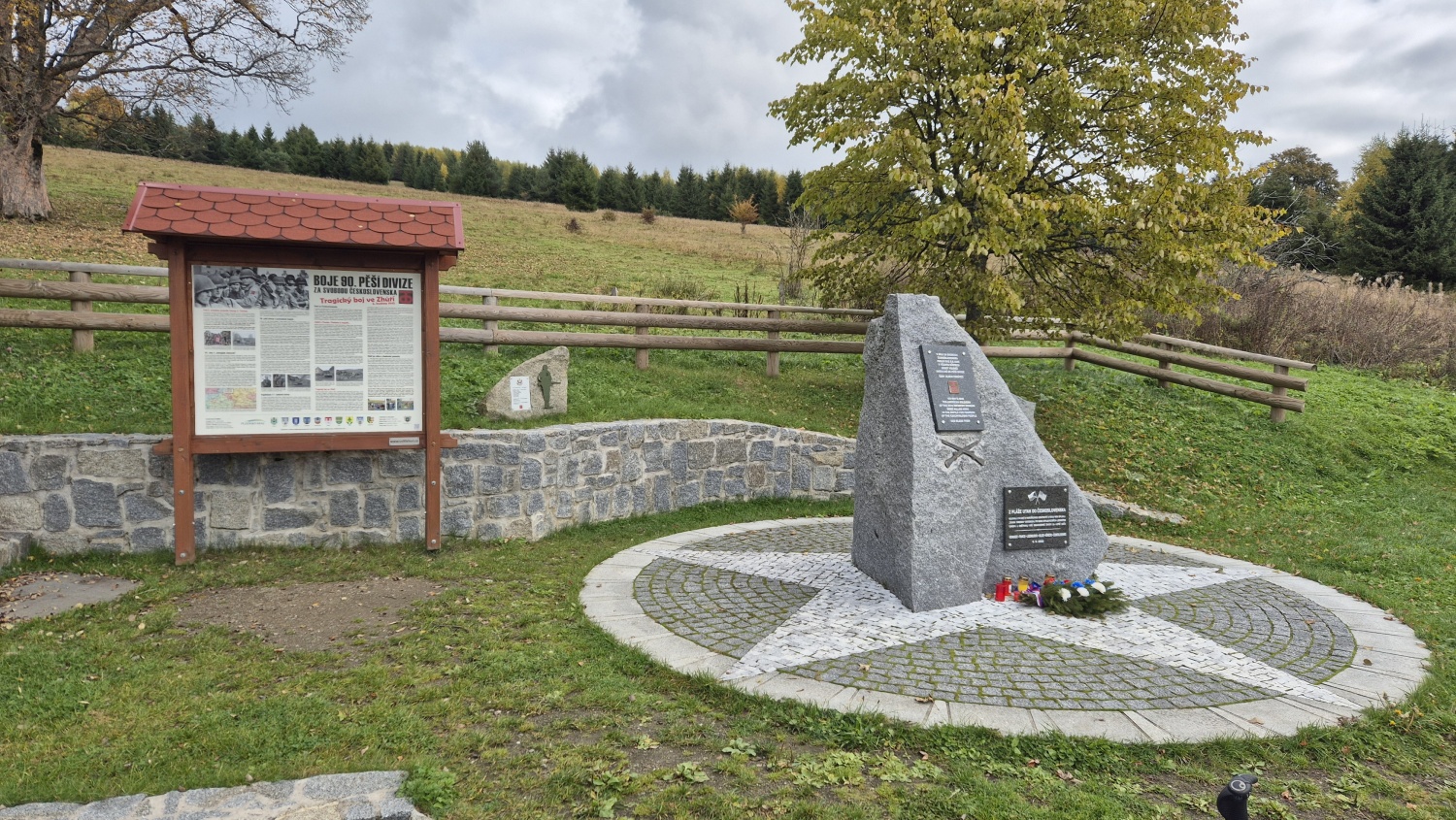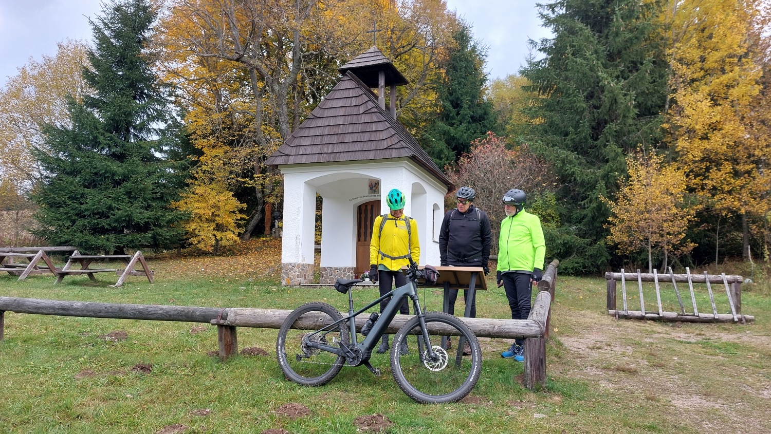 Mit Franz Uhrmann als Bike- Guide trafen sich 5 Radbegeisterte mit ihren E-Bikes, um ab Gerlova Hut (Gerlhütte) zuerst zur Regenquelle zu fahren. Der Fluss Řezná entspringt im Landschaftsschutzgebiet Šumava auf einer Höhe von 1031 m NN. Er fließt durch Železná Ruda (Markt Eisenstein) und verläßt nach 8,2 km auf 709 m NN Tschechien. Es ist der einzige direkte Zufluss der Donau, der in Böhmen entspringt und über die Donau in das Schwarze Meer fließt. Nach kurzem Aufenthalt an der Quelle geht die Fahrt ein Stück auf der Forststraße zurück, bis dann die Abzweigung nach Šmauzy und U Obrázku genommen wurde. Nach Überquerung der Straße Nr.27, die nach Javorná führt, ka die kleine Gruppe dann schließlich zu der ehemaligen, fast verlassenen Ortschaft Zhůří am Ahornberg, im Nationalpark Sumava an.