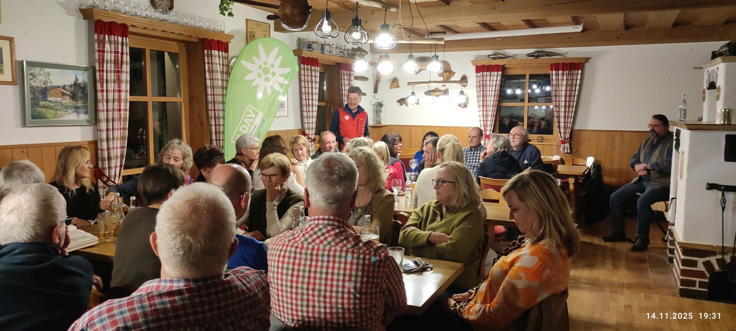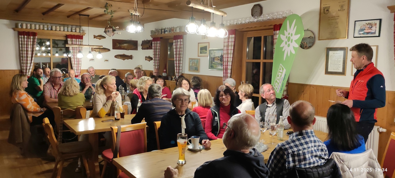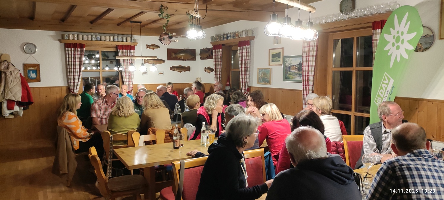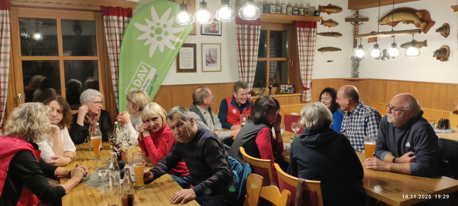 Nach den Herbstwanderungen in den Bergen und im Bayerischen Wald ist es nun schon zur guten Tradition geworden, die Saison mit einem Hüttenabend im Fischerhäusl des Fischereivereines Waldkirchen abzuschließen. Dieser fand dort heuer bereits zum vierten Mal statt. Anstatt des monatlichen Stammtischs im Vereinslokal Brodinger konnte der Vorsitzende der DAV- Ortsgruppe Freyung, Josef Schwaiberger, wieder eine stattliche Anzahl von Mitgliedern aus dem Landkreis Freyung/Grafenau, wie auch aus dem Landkreis Passau, begrüßen. Des Weiteren konnte auch Sepp Haselsteiner begrüßt werden, der, wie gewohnt, mit seiner Gitarre und Gesang für den musikalischen Rahmen sorgte. Der Vorsitzende bedankte sich natürlich auch bei den Aktiven vom Fischereiverein, die mit viel Engagement die Führung des Vereins und auch das Fischerhäusl auf komplett neue Füße gestellt haben – so mancher der Anwesenden konnte sich vom neuen Gebäude mit nagelneuer Küche und einem perfekt gestalteten Außenbereich, sowie den Veränderungen im Gastraum selbst überzeugen. So hat die Mannschaft des Fischervereins die bestellten Fische schon perfekt vorbereitet, da Manfred Eberl seine Anmeldelisten mit Essenswunsch in gewohnter Weise abgeliefert hat. Das bestellte Essen wurde in Buffetform bereitgestellt und die Mannschaft des Fischereivereins bewirtete mit Umsicht und Perfektion. Nach ein paar stimmungsvollen Liedern wurde dann der Nachtisch mit Kaffee und schmackhaften Kuchen vorbereitet – alle gebacken und bereitgestellt von den Mitgliedern. Dafür gab es vom Vorsitzenden ein großes „Vergelt´s Gott“ an die Spender.
