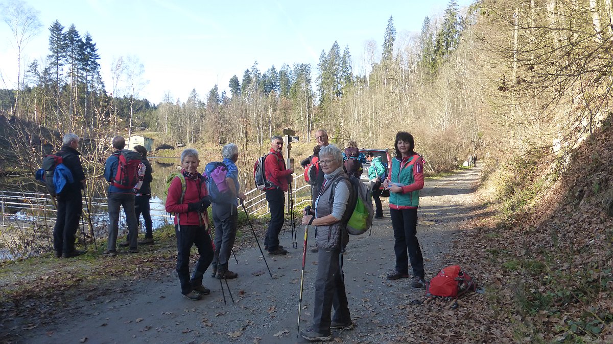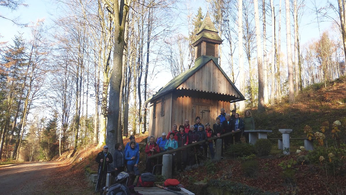 20 Teilnehmer starteten mit Tourenbegleiterin Rita Gell am 23. November zu der letzten Wanderung der Ortsgruppe Freyung im Jahr 2019. Vom Treffpunkt beim Berggasthof Gut Lichtenau, mit herrlichem Panoramablick ins Donautal und bis in die Alpen, wanderte die Gruppe zuerst auf der Straße und dann rechts weiter auf Wanderweg Nr. 11 durch Waldwege hinab zur Kapelle Heilig Röhren. An diesem schönen Platz wurde erst einmal eine Fotopause eingelegt. Es ging ein paar Meter zurück und weiter auf gut markiertem Weg durch den Wald oberhalb von Wolkar und über
